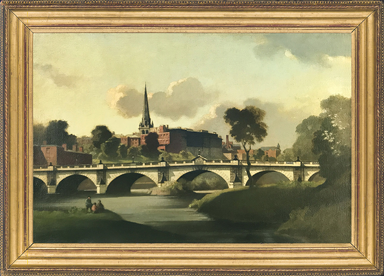 Nicholls often uses bridges to orchestra his views of towns and cities within the landscape [see his painting of the Ponte di Pietra, Verona]. This compositional motif allows him to separate the town from the spectator, lending it a sense of romantic and ideal isolation – even here, where this sense is undercut by the uncompromising bulk of factories and chimneys. The slanting run of arches which divide the unspoilt green banks from the redbrick city recalls Canaletto’s paintings of bridges over the Thames; this 18th century twist on the view is reinforced by the little group of men on the left-hand bank, who might have walked out of one of Canaletto’s own riverscapes. It gives added complexity to Nicholls’s work, as though he were painting Shrewsbury and its surroundings through time, and is another aspect of his concern with the classical and permanent in the landscape. Beautifully lit, the cloudscape is touched with meltingly warm pastels, again recalling Canaletto’s views of the Thames.