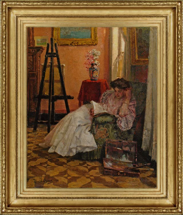 This is a good example of the studies of figures in interiors, occupied by work or pleasure, at which the Oyens twins excelled. Echoes of Vermeer and Chardin resonate in their work; here, the subject does look indirectly back to Vermeer, with its side-lit room and reading woman, but it is also one in the long line of women painted with a book, going back to, for instance, frescoes of Sappho from Pompeii. Here, the catalyst is leisure rather than creation or piety; the woman is so absorbed in her novel that she has become a passive object in the still life of easel, vase and painting box, allowing the light to flow over the almost abstract shapes of skirt and sleeve, and her colouring to become part of the overall harmony.