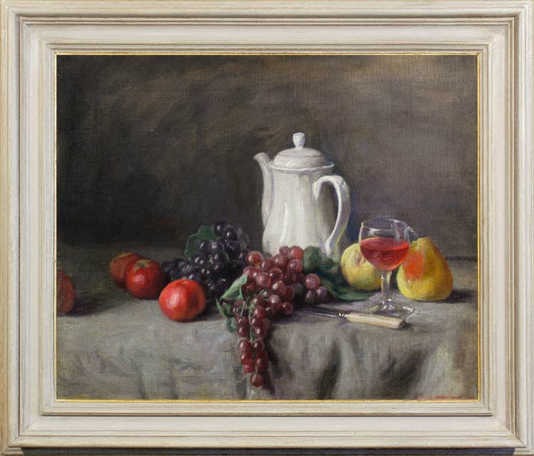 This painting is closely related to Chardin’s Still life with teapot, grapes, chestnuts, and a pear (Boston MFA), mirroring and undercutting its composition (coffee pot facing the other way, red instead of white grapes, draped instead of bare table). Chardin is the sine qua non for many still life painters; his compositions possess both concrete reality and a metaphysical quality hinting at the Platonic ideal; many of them also managing to transcend their historic period, as in this case. Weissbort’s fascination with Chardin’s achievements underpins many of his still life paintings, rooting them in the long tradition of European still life artists, and drawing in the spectator, who often experiences a similar fascination with this apparently modest genre of painting.